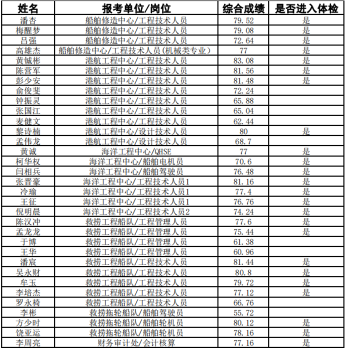 按照《广州打捞局2025年面向社会公开招聘工作人员公告》及相关规定,已完成报名、资格审查、笔试、面试环节,现进入体检等环节,名单如下: